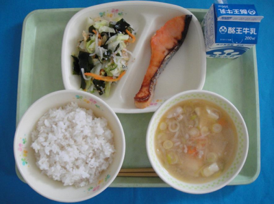 今日は、明治22年の給食の始まりとなった献立です。当時は「おにぎり」と、「焼き魚」、「つけもの」の3品だけで、今日の給食についた豚汁、牛乳は出ていませんでした。