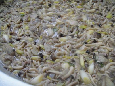 今日は、山形いも煮を忠実に再現するために、スライサーを使わず野菜を手で切ってもらいました。そのため、ねぎやごぼうがいつもと違う切り方で入っています。また、味付けは、砂糖、しょうゆ、酒とシンプルで福島牛のうま味が味わえる いも煮になっているかと思います。