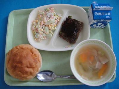 2021年2月3日 12時11分米粉パン コンソメスープ 福島牛ミートローフ コールスローサラダ 牛乳