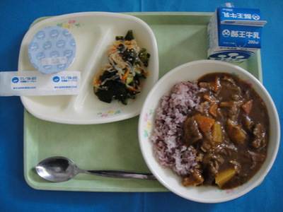 十穀米、牛肉、カレー粉(小麦粉)、きゅうり、ヨーグルト、牛乳は福島県産。米、玉ねぎ、人参、大根は矢吹町産です。今日の献立は主食・主菜・副菜・デザート・牛乳すべてに福島県産のもを使用しています。