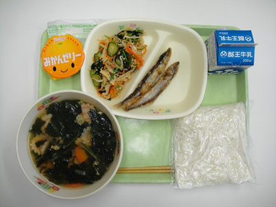 肉うどん ししゃものから揚げ ピリ辛野菜あえ みかんゼリー 牛乳