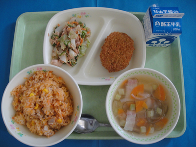 主食のチキンライスは、給食室での手作りです。炊きあがったごはんに、炒めたチキンライスの具を混ぜ込んでいます。写真はありませんが、調理員さんたちが心を込めて作ってくださいました。