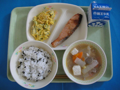 今週の月曜日から水曜日にかけて、給食では、学校で行われている「朝食について見直そう週間運動」にあわせ、朝食モデル献立を用意しています。自分の朝食と比較しながら、給食をいただきましょう。