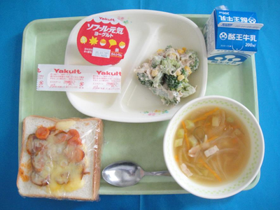 今日の給食は、調理員さんと実習生がチーズたっぷりのピザトーストを手作りしてくださいました。朝食モデル献立も今日が最終日です。残り2日もバランスのよい朝食を意識して、朝食を食べて登校するようにしましょう。