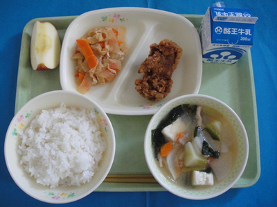 ごはん 小松菜汁 川俣シャモのから揚げ ひきないり りんご 牛乳
