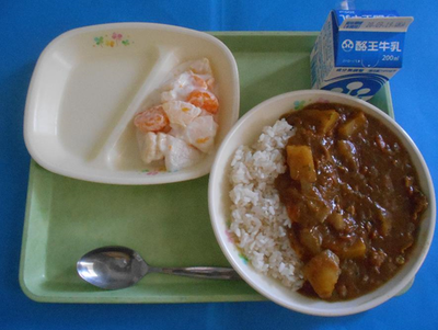 ポークカレーライス(麦ごはん) なし入りフルーツヨーグルトあえ 牛乳