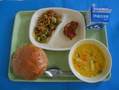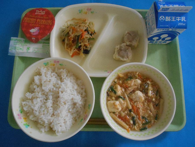 今日の主菜は、四川料理の一つである麻婆豆腐です。給食の麻婆豆腐は、誰でも食べられるように辛みがありません。しかし、にんにくやしょうが、にらの香りで食欲がそそられます。
