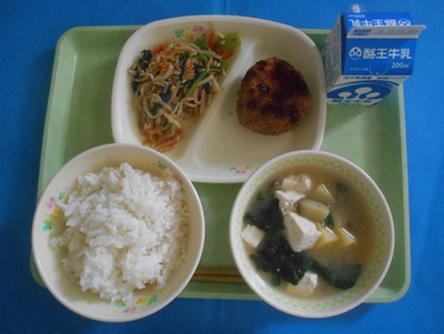 ごはん なすのみそ汁 手作りコロッケ 野菜の大豆あえ 牛乳