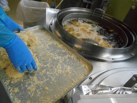 今日は、みんなが大好きなきな粉揚げパンです。ひとつひとつ、給食室で揚げています。