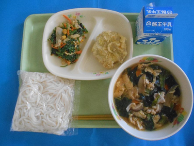 きつねうどん さつまいもの天ぷら 野菜のごまみそあえ 牛乳