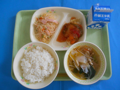 先週の残菜は・・・、副菜2.5Kg、牛乳…20本でした。先週は、残菜が少ない日が続きました。これからも給食委員会の目標である「残菜ゼロ」を目指して、給食をいただいて欲しいと思います。