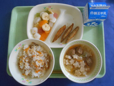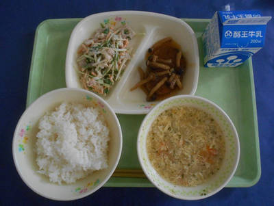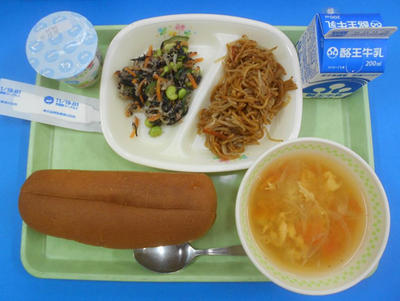 今日の給食の牛乳、卵、玉ねぎ、きゅうり、ももは福島県の食材を使用しています。福島県でつくられた食材を味わって食べてほしいと思います。