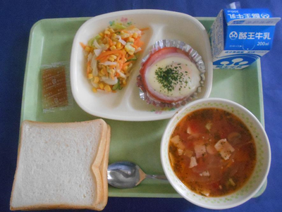 焼きそばパン トマトスープ ひじきと枝豆のサラダ ヨーグルト 牛乳