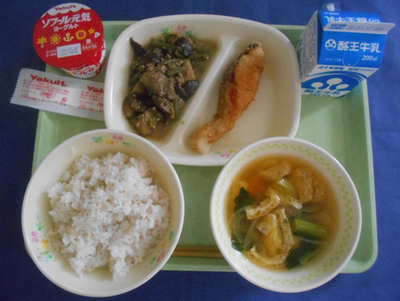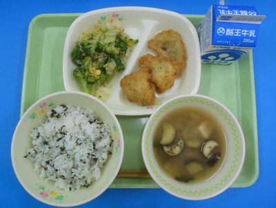 わかめごはん なすのみそ汁 あじフリッター ブロッコリーのごまあえ 牛乳
