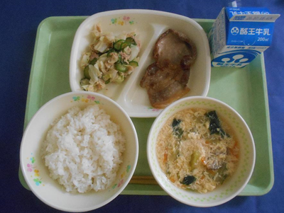 ごはん かきたま汁 豚肉のしょうが焼き ツナときゅうりの中華あえ 牛乳