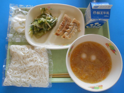 肉みそうどん ぎょうざ 水菜のサラダ パインコンポート 牛乳