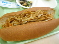 今日は人気の焼きそばパンの日でした。炭水化物with炭水化物の献立なので、年に1回ほどしか出ません。コッペパンに焼きそばを挟むと、すごいボリュームがありました。