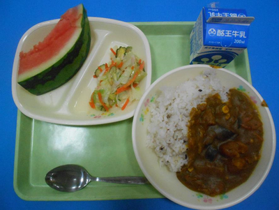 今日は、いまが旬の野菜や果物を献立に取り入れました。カレーライスのなす、かぼちゃ、いんげん、トマト、とうもろこしで5種類。サラダに入った「レタス」「きゅうり」で7種類。そして、デザートの「すいか」で8種類。