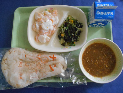 2020年6月26日 12時40分ナン キーマカレー 海藻サラダ フルーツヨーグルトあえ 牛乳