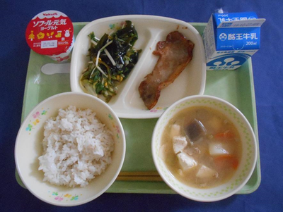 麦ごはん 打ち豆入り豚汁 豚肉のしょうが焼き 海藻サラダ 牛乳 ヨーグルト