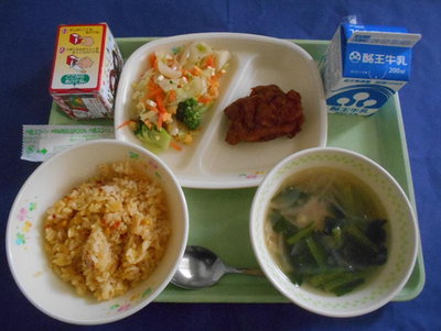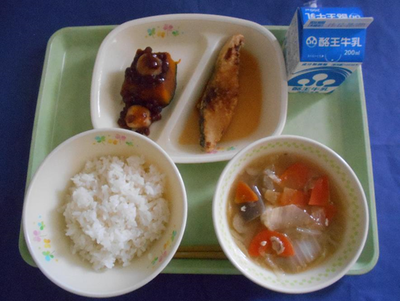 今日のフライドチキンは給食室の手作りです。昨年度もフライドチキンを手作りしましたが、昨年度よりおいしいフライドチキンになったと思います。(今年は衣に秘密があります!)今年最後の給食のお味はいかがだったでしょうか?