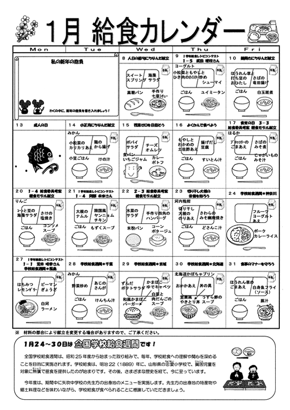新しい年を迎え、気持ちも新たに学年最後の学期がスタートしました。今年も子どもたちの健やかな成長を願って、安全でおいしい給食づくりに努めていきます。本年もよろしくお願いいたします。