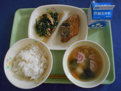 ごはん 白玉雑煮 さばの竜田揚げ ほうれん草と打ち豆のおひたし 牛乳