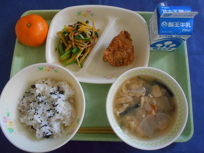小豆ごはん けの汁 鶏のから揚げ 小松菜のカリカリあえ 牛乳 みかん