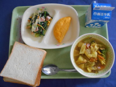 食パン いちごジャム カレーポトフ チーズオムレツ ポパイサラダ 牛乳