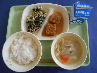 2020年1月16日 12時14分ごはん すいとん汁 揚げだし豆腐 もやしとわかめの土佐酢あえ 牛乳
