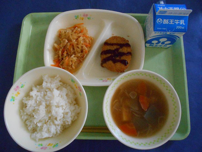 ごはん 八杯汁 キャベツメンチカツ(ソース) ひきな炒り 牛乳