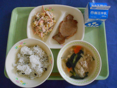 わかめごはん 小松菜汁 豚肉のしょうが焼き さつまいものサラダ 牛乳