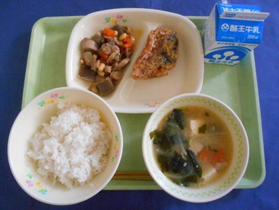 ごはん どさんこ汁 さばの竜田揚げ 五目豆 牛乳