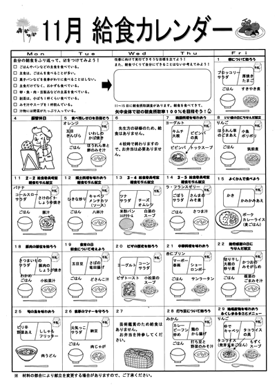 11月のお弁当の日は27日(水)です。お弁当の準備をお願いいたします。