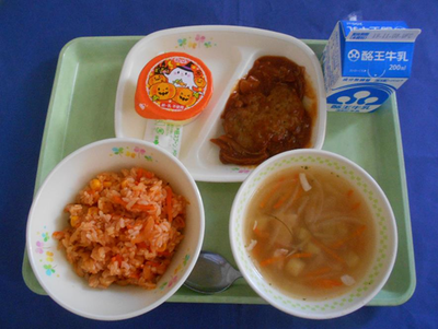 ハロウィンは、秋の農作物などの収穫をお祝いし、悪いおばけを追い払う行事です。かぼちゃの中身をくり抜いて、怖い顔を作り、おばけを怖がらせて追い払います。今日は、かぼちゃの入っているかぼちゃ型のハンバーグとパンプキンババロアにしました。しっかり食べて風邪に負けない体をつくりましょう!