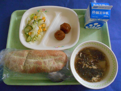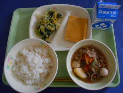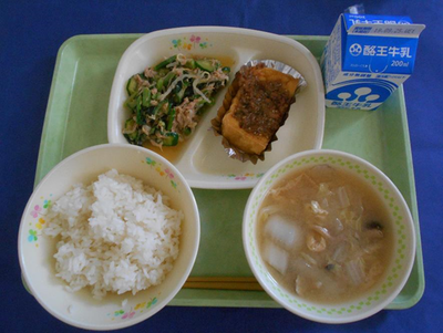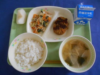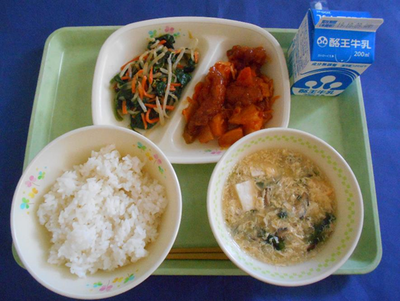 今日の給食の写真は、実際に1年1組教室で生徒が配膳したものを撮影しました。お茶わんやお皿からはみ出すことなく、上手に盛り付けができています。これからも正しくきれいな配膳を心がけてほしいと思います。