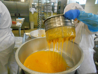 今日の厚焼き玉子は、給食室の手作りです。31キロの卵をひとつひとつ割って、豆腐やだし汁、調味料を混ぜ合わせて焼き上げました。思っていたよりも薄い玉子焼きになってしまいましたが、お味はいかがだったでしょうか?