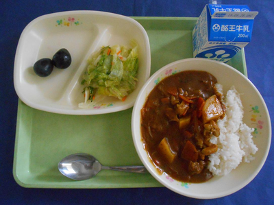 チキンカレーライス フレンチサラダ ぶどう 牛乳