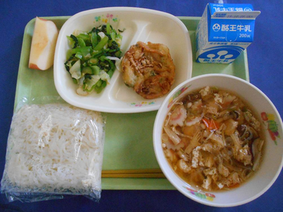 きのこうどん 小魚入りかきあげ 小松菜のおひたし りんご 牛乳