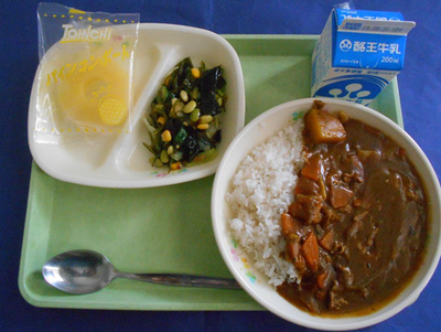 今日は、みんなの大好きなカレーです。給食のカレーの日には、いつも一緒に登場するメニューがあります。その、メニューとは…副菜のサラダです。カレーの日でも時間をかけ、よくかんで食べられるように かみごたえのあるサラダをつけています。かむことを意識していただきましょう。