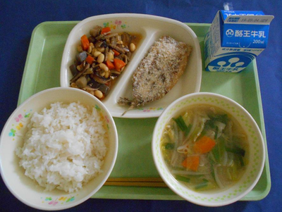 ごはん どさんこ汁 いわしのかわり揚げ 五目豆 牛乳