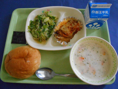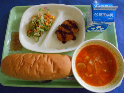 コッペパン ミネストローネ 県産ポークコロッケ(ソース) きゅうりとツナのサラダ 県産ももジャム 牛乳