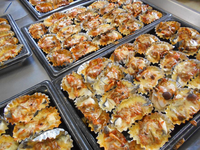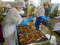 今日は約360切の白身魚に 炒めた玉ねぎとピーマン、ぶなしめじ、ピザソース、チーズをのせて焼きあげました。エアコンがない給食室での、作業はとても過酷です。手作りの味を、味わっていただきましょう。米粉パンは、お米の味がわかるようによくかんで食べてみてくださいね。