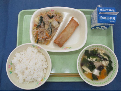 ごはん 中華スープ 春巻き 炒合菜(チャーホーサイ) 牛乳