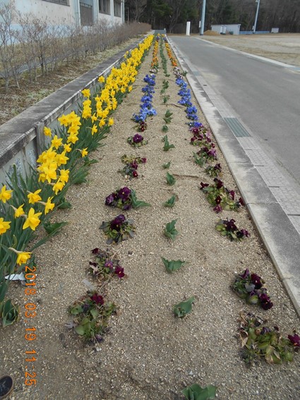 校庭のサッカーを見て、ふと目を落とすと、昨年植えた球根の花とパンジーがきれいに咲いています。