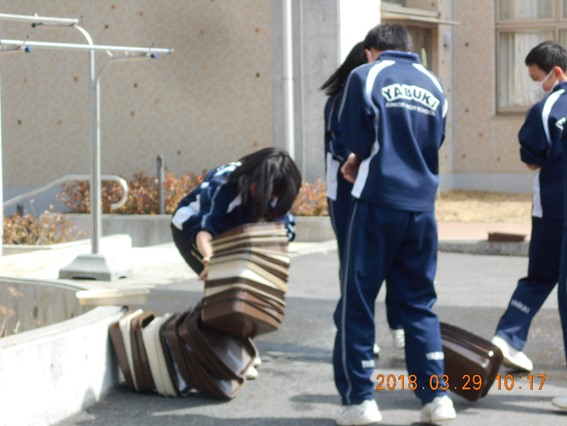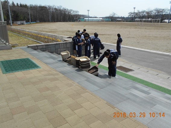 2018年3月29日 11時20分部活に来た2年生が、1年間お世話になった下駄箱を掃除していました。