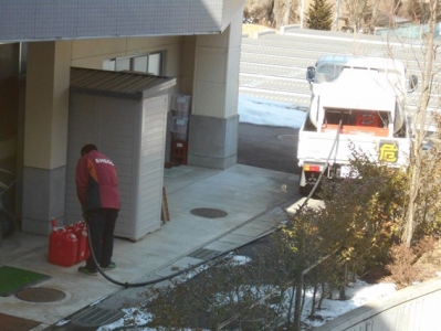 灯油です。体育館の横にある地下タンクに2,000ℓ、給食室のポリタンク4個分