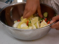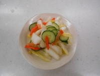 始めに白菜、人参、キュウリを切ります。 塩を入れて混ぜます。 重石(ボールに水を入れたもの)