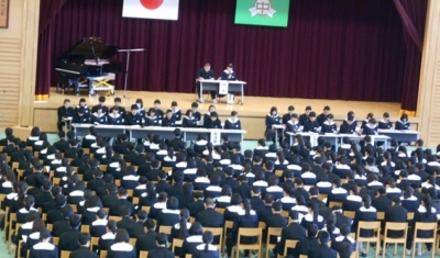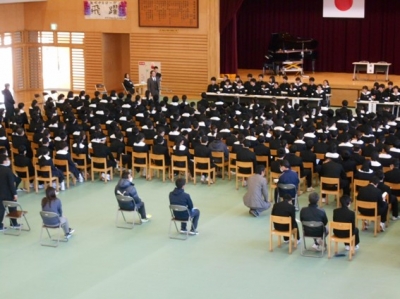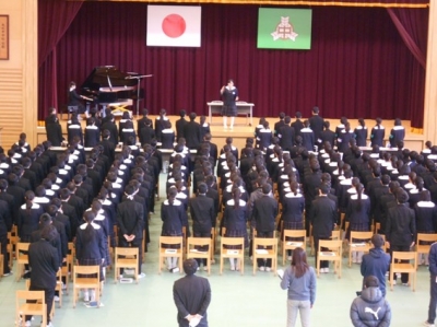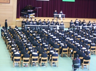 役員と一般生徒が向かい合って座っていましたが、校歌は全員前を向いて歌います。