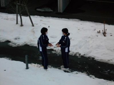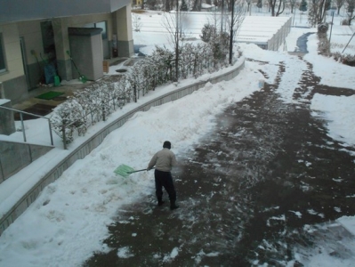 今朝早く、生徒のために歩くところを雪かきしている職員がいました。